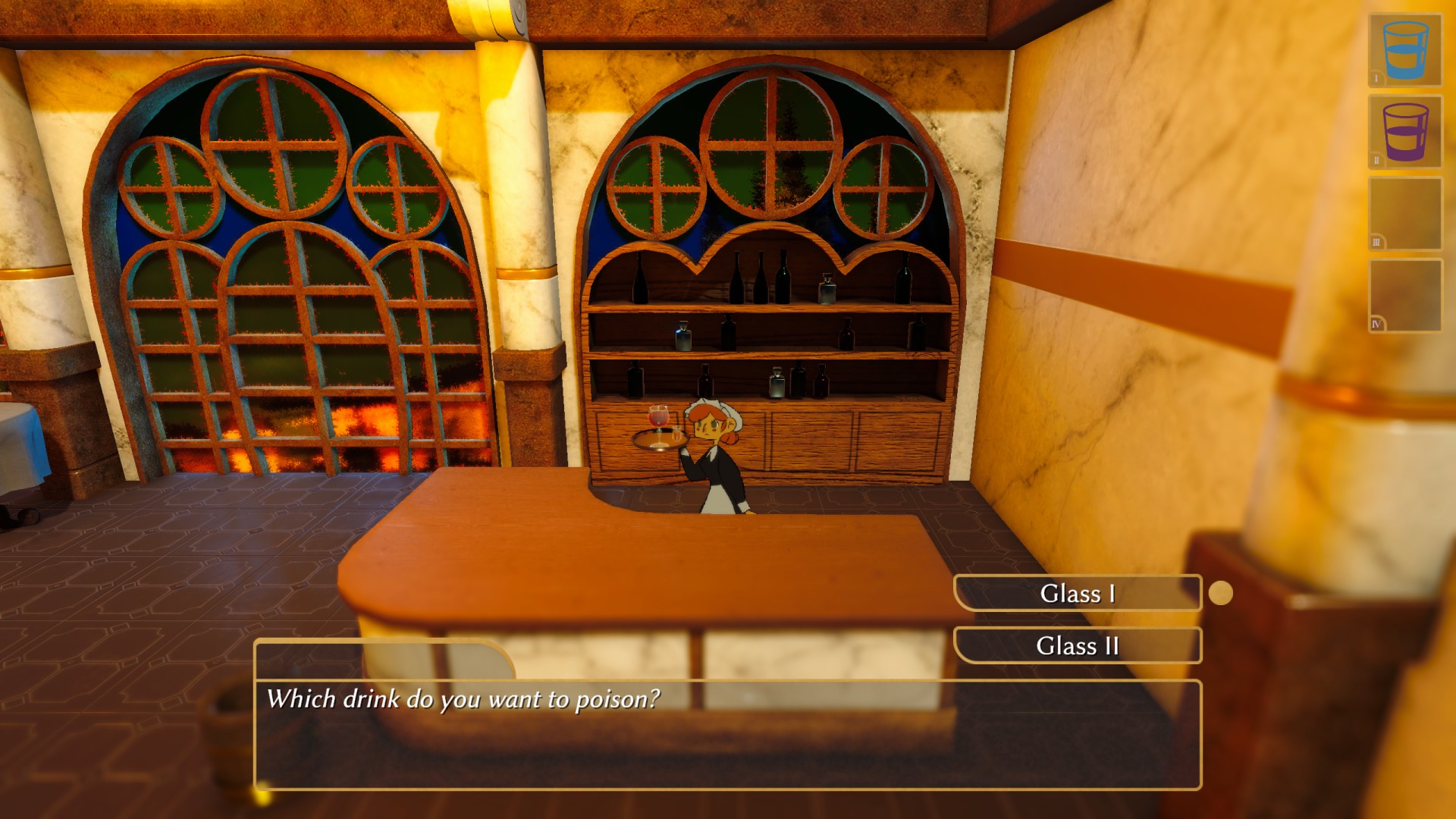 This is the story of a humble servant with a crucial objective. You casually hear a dialogue between two guards: someone is going to introduce to the masquerade aiming to kill the queen. The queen is in danger, and you don’t know who to trust. So, you decide to act alone. Talk to the guests, find out who the killer is and poison their drink before the murder is completed. Don’t forget your duties, though, or you will be dismissed before even trying.